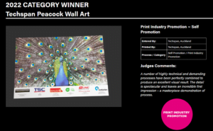 Following 2020’s success with the ‘Techspan Tui’ we were determined to create another wonderful piece of art to show off the creative skills of each of our partners as well as the potential of foiling in print. After months of hard work and collaboration, The Peacock was made. It is a stunning piece which shows off the photography of Bernadette Fastnedge and embellishes each plume of colour with a shinning foil treatment. After much effort to create the piece, we are thrilled to have been awarded a total of three medals at the recent New Zealand Pride in Print Awards 2022. Two of those medals being a Gold, and one being a Best in Category for Print Industry Promotion!